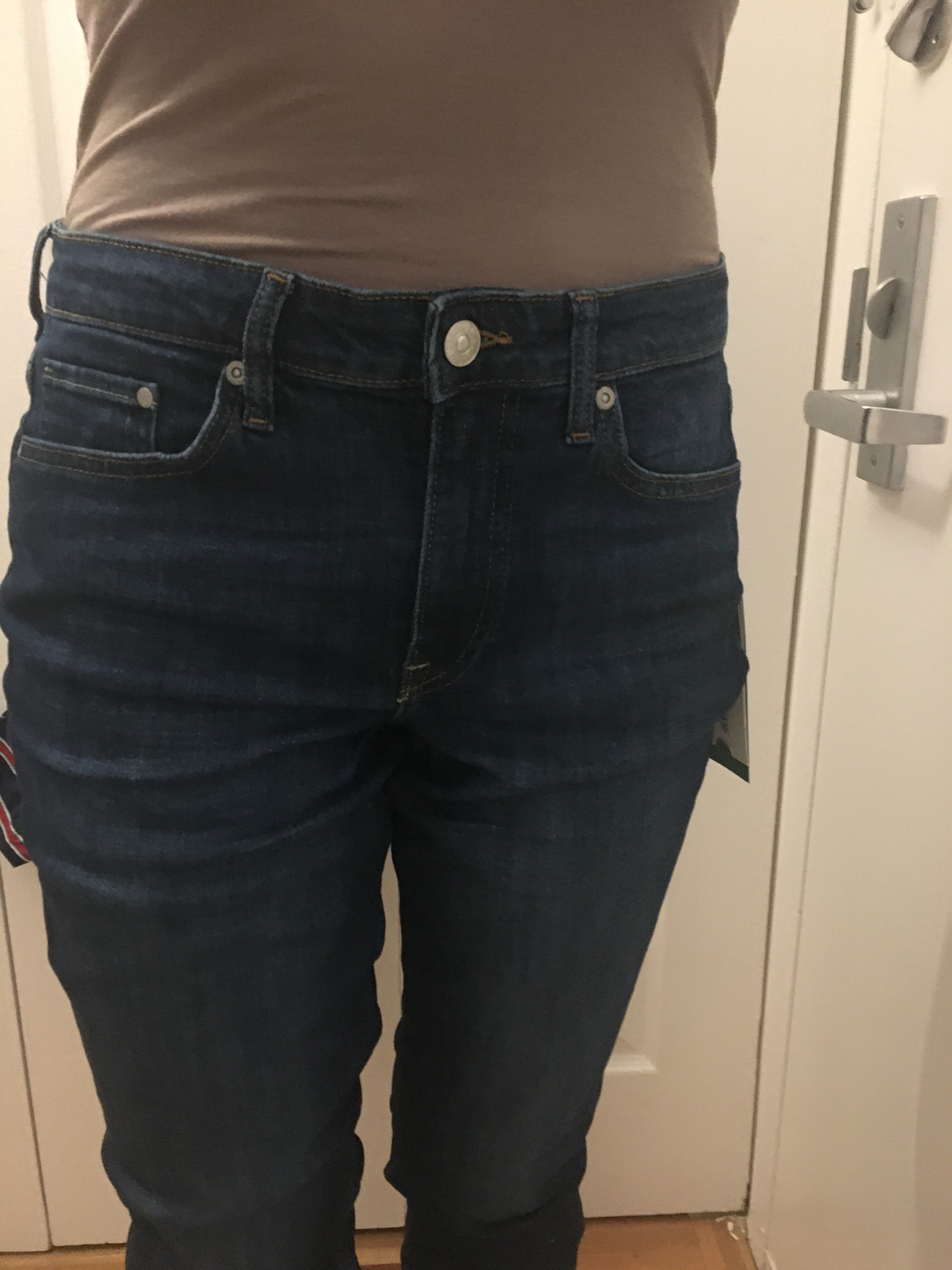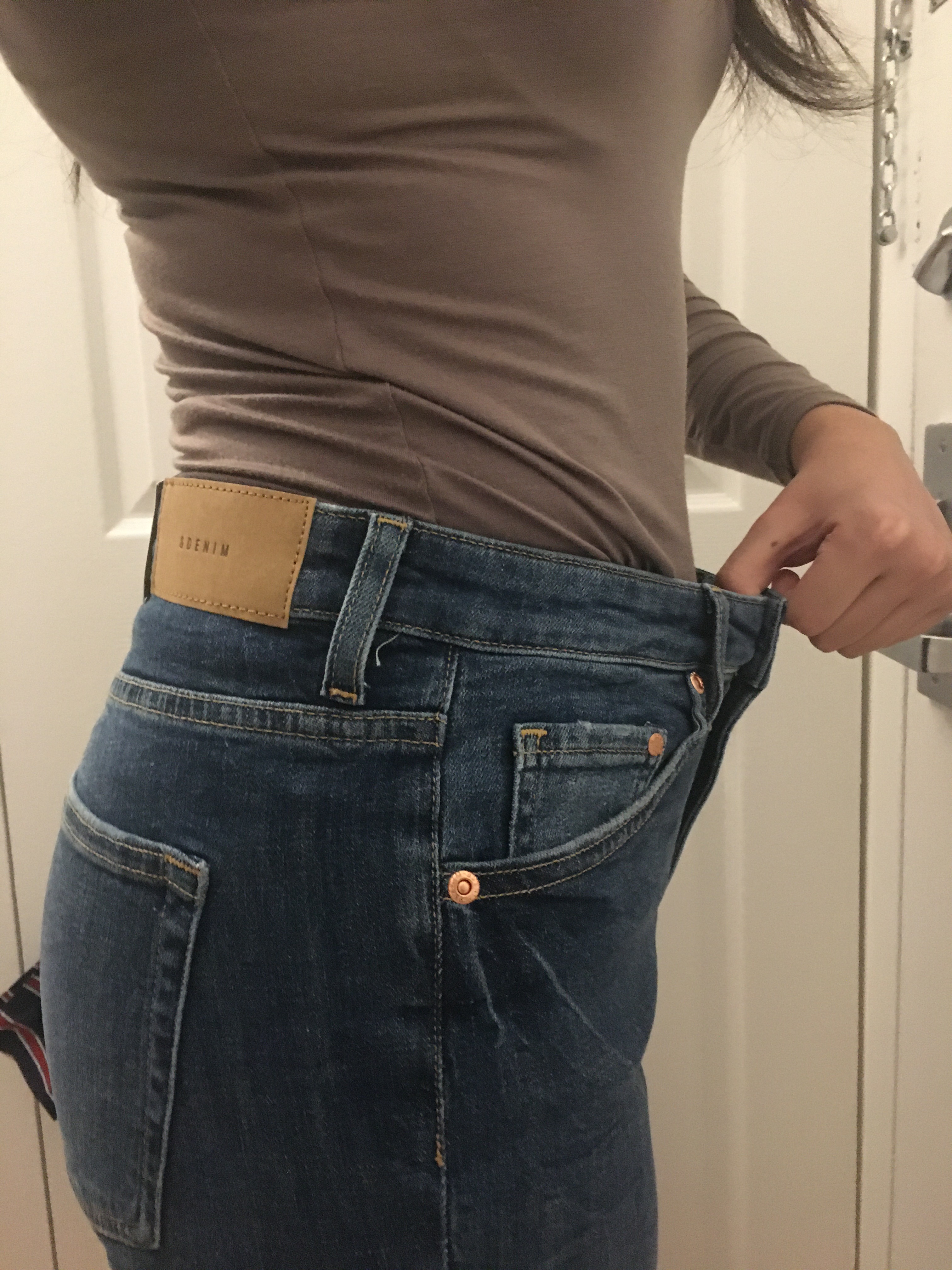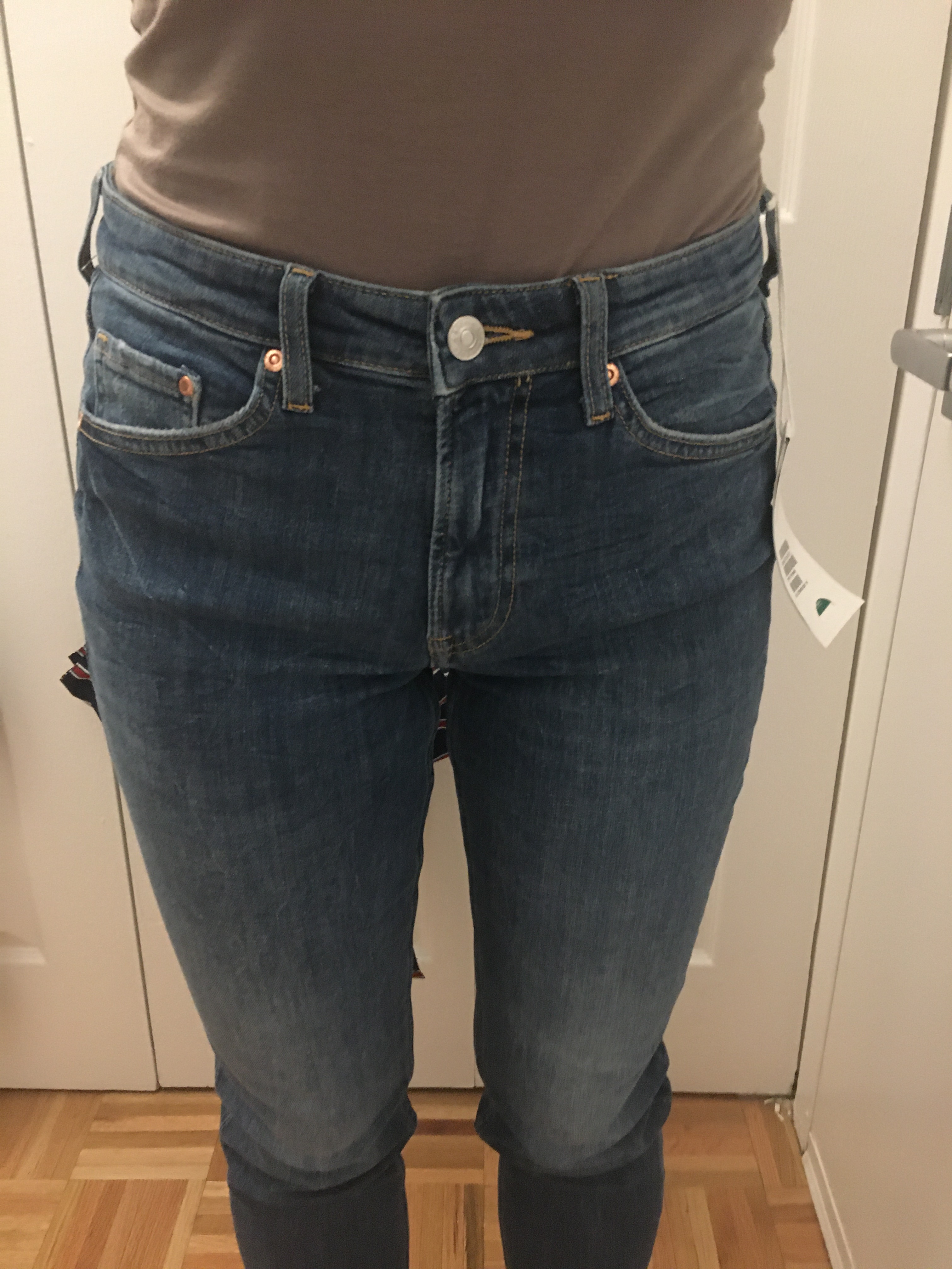 No – I purchased two of H&M’s Girlfriend jeans in different colors and sizes to see which fit better, and this is the larger of the two, size 6. I remembered H&M being small with their sizes, but also remembered that H&M tried to change their garment sizing so I wasn’t entirely sure what size I should get. And as you can see in the pictures, size 6 is way too big. There is just excess fabric everywhere. The waist, the thighs, the inseam. I marked them as a no simply because these are too large, but I think I might exchange them for a smaller size, because I do like them and the deep blue color is something I don’t have in my closet.
