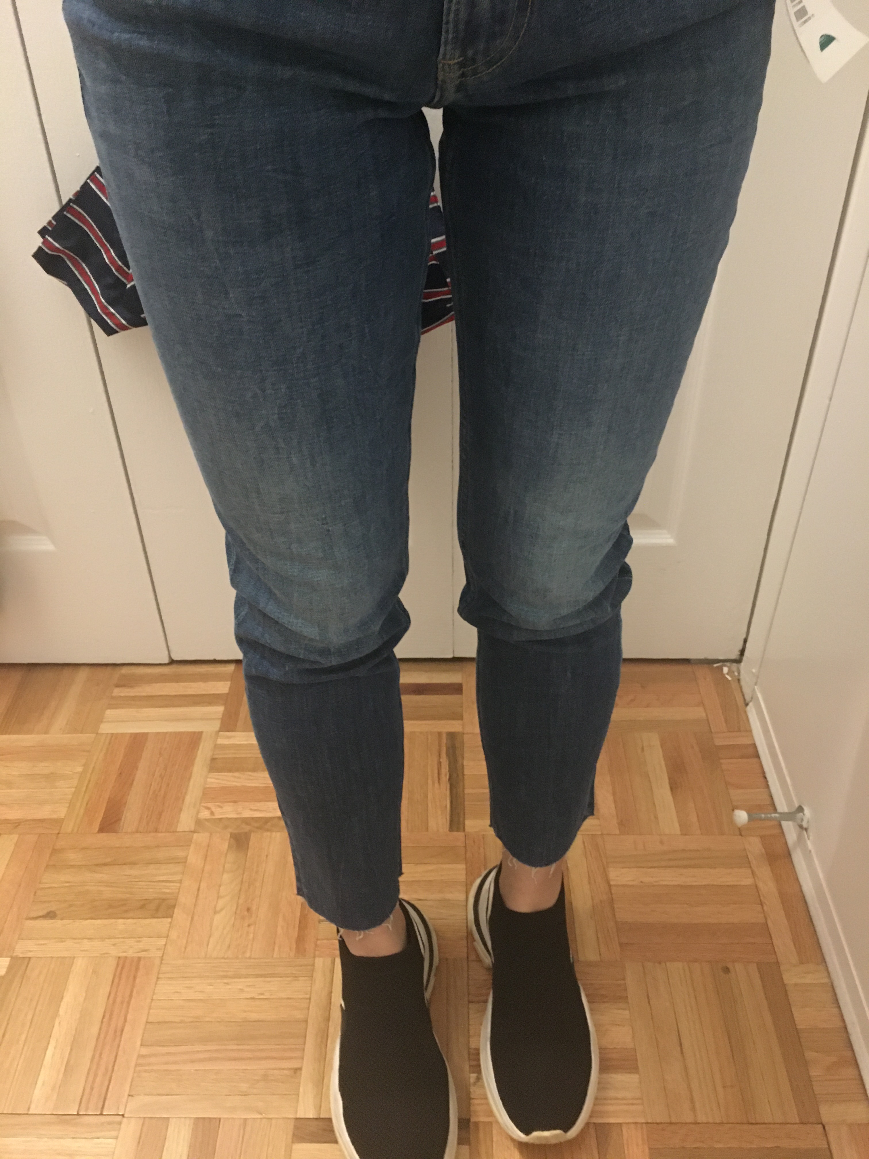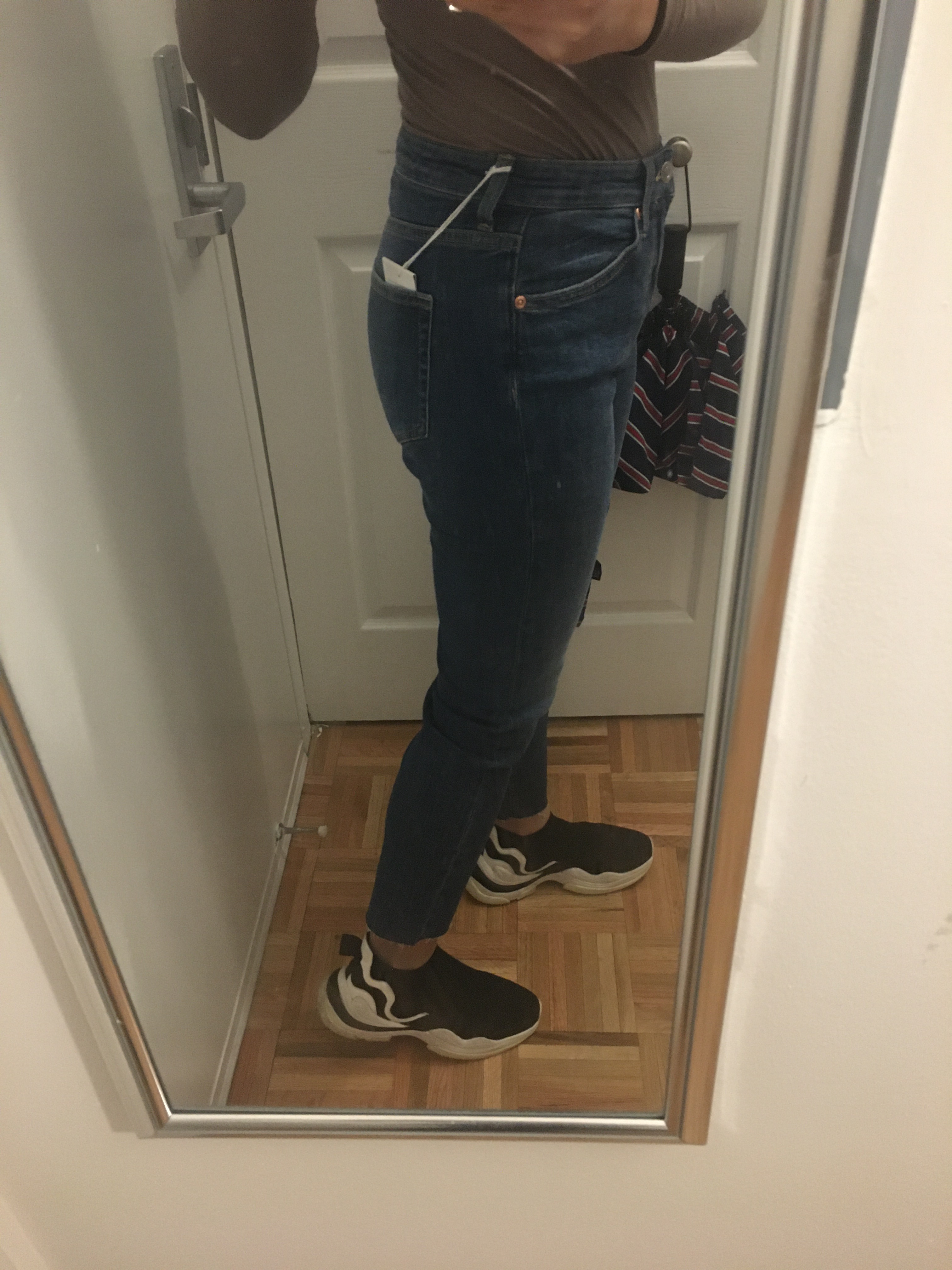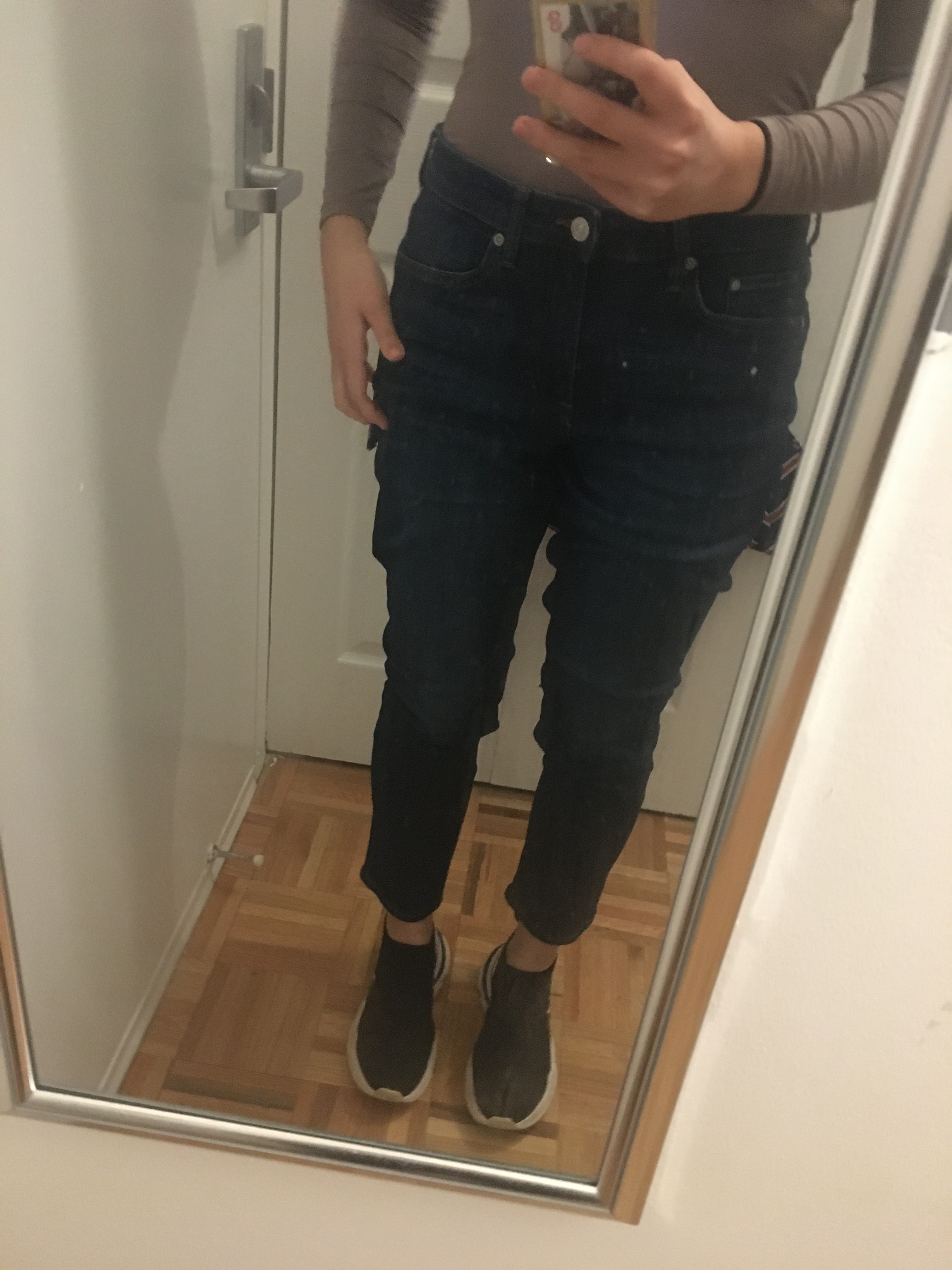 No – I purchased two of H&M’s Girlfriend jeans in different colors and sizes to see which fit better, and this is the larger of the two, size 6. I remembered H&M being small with their sizes, but also remembered that H&M tried to change their garment sizing so I wasn’t entirely sure what size I should get. And as you can see in the pictures, size 6 is way too big. There is just excess fabric everywhere. The waist, the thighs, the inseam. I marked them as a no simply because these are too large, but I think I might exchange them for a smaller size, because I do like them and the deep blue color is something I don’t have in my closet.